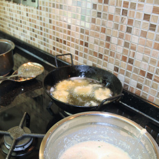 Remove from oil and place in a pan with hot water. Leave the fried vada in the water to soften.