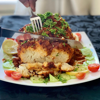 Rub the mixture on the inside of the cauliflower then turn it over and brush the mixture all over the cauliflower. Place it on an oven dish and cover with foil and roast in the oven for 1 hour, or until the cauliflower is soft. Remove the foil and cook further until the outside becomes lightly browned