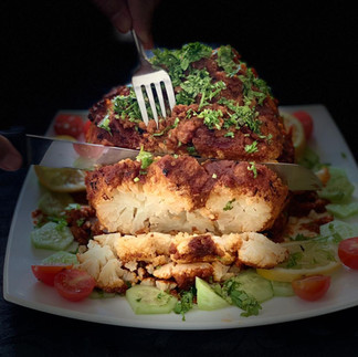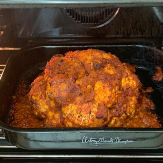 In a small bowl, stir in the above mixture and add all the spices, 1 tsp Garam masala,1 tsp Chili flakes,1 tsp Black pepper, 1-2 tsp Red Chili powder, 2 tsp Coriander powder,1 tsp Kasthuri methi, Salt to taste. Add 1 cup Strained Tomatoes (boxed) may need more or less depends on the size of the cauliflower head, finally add the Olive oil and stir.